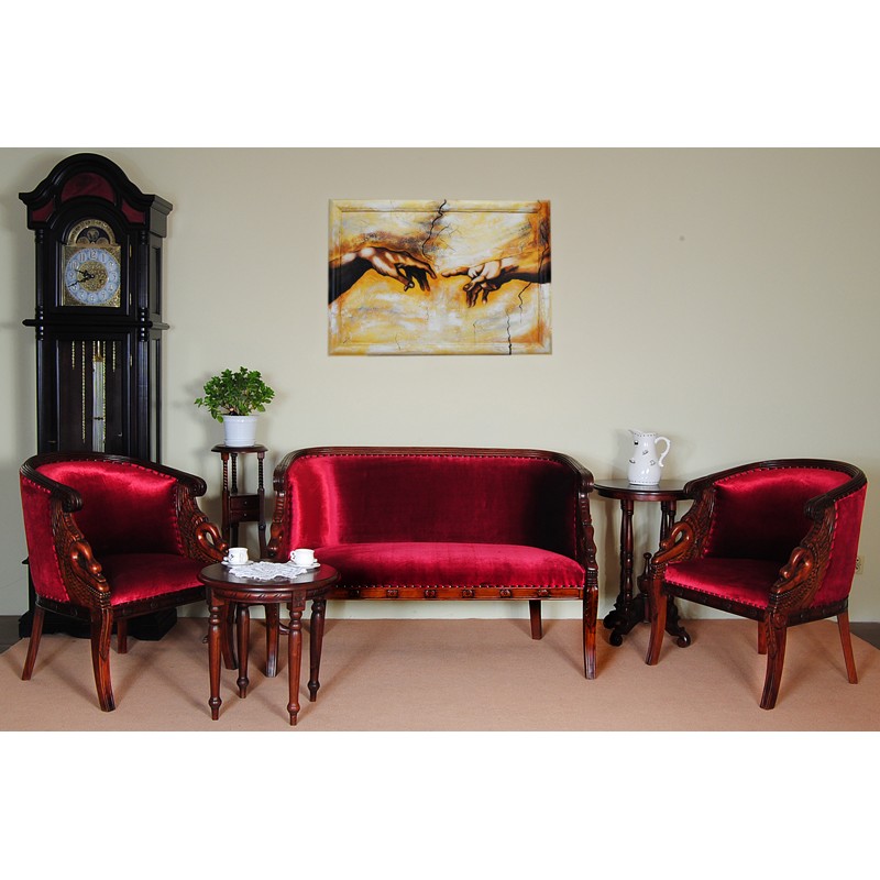 Na podłokietnikach sofy widnieją ręcznie rzeźbione łabędzie – symbol gracji, spokoju i doskonałości. Ten detal sprawia, że mebel staje się wyjątkową ozdobą wnętrza. Każda linia, każde skrzydło i każde pióro wyrzeźbione w drewnie to efekt pracy doświadczonych rzemieślników, którzy dbają o najmniejszy detal.