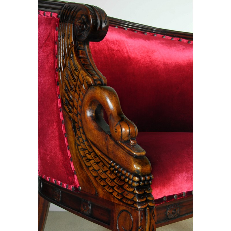 Ta sofa z misternie rzeźbionymi detalami w formie łabędzi zachwyca precyzją wykonania i wyjątkowym stylem.